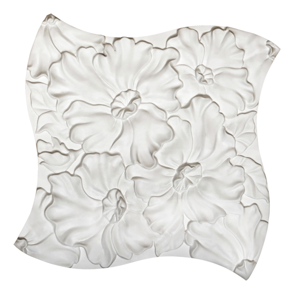 Квадратный гипсовый пазл с мягкими деформированными краями и плотным цветочным орнаментом. Вся поверхность покрыта многослойными белыми цветами с детализированными лепестками, создающими выраженный объемный эффект. Центр каждого цветка тщательно проработан и обладает собственным рельефом. Композиция составлена из цветков разного размера и расположения, равномерно заполняющих пространство и образующих единый гармоничный узор.