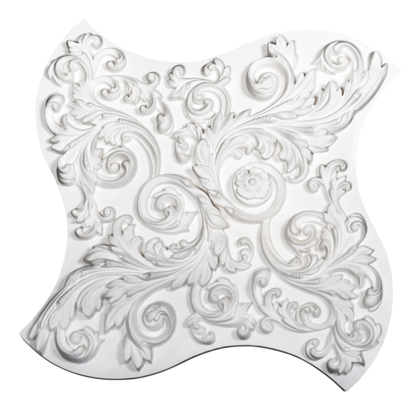 Гипсовый пазл квадратной формы с волнообразными сторонами для создания настенного декора в стиле барокко. Поверхность элементов покрыта сложным лепным орнаментом, включающим симметричную композицию из листьев, завитков и цветов. Рельефный узор отличается глубокой детализацией и создает выразительную игру света и тени.