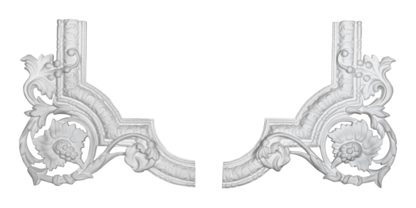 Парные гипсовые уголки, зеркально отражающие друг друга, предназначены для точного симметричного оформления углов. Каждый уголок состоит из вертикального элемента, стилизованного под колонну, и плавно изогнутой части, образующей дугу окружности и обеспечивающей мягкий переход между плоскостями. Поверхность украшена объёмным рельефным узором из классических растительных мотивов: виноградных лоз, акантовых листьев и завитков.