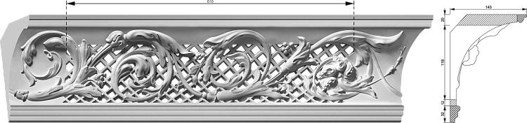 Трехуровневый карниз с геометрически-растительным орнаментом для ценителей сложных композиций. Четкая структура построена на контрасте простых и сложных элементов: верхняя и нижняя полосы выполнены в виде строгих прямоугольных молдингов, обрамляющих центральную декоративную панель. Такое построение создает архитектурную уравновешенность и ясность линий.