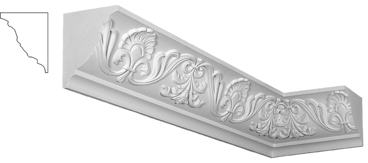 Гипсовый карниз с трёхчастной архитектурной структурой, создающий классический акцент в интерьере. Верхний слой украшен непрерывным рельефным узором из стилизованных листьев и завитков, которые образуют изящный растительный фриз. Средний слой представляет собой гладкую плоскую поверхность, служащую лаконичным фоном и подчёркивающую выразительность орнамента. Нижний закруглённый слой мягко завершает композицию, обеспечивая плавный переход к стене.