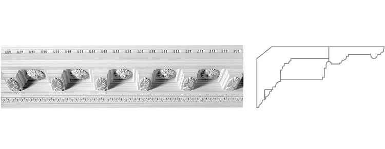 Многоуровневый карниз с насыщенным орнаментом, сочетающий геометрическую строгость и классическую растительную тематику. Верхняя часть оформлена рядом мелких прямоугольных элементов, создающих четкий ритмичный акцент и подчеркивающих горизонтальную направленность карниза.