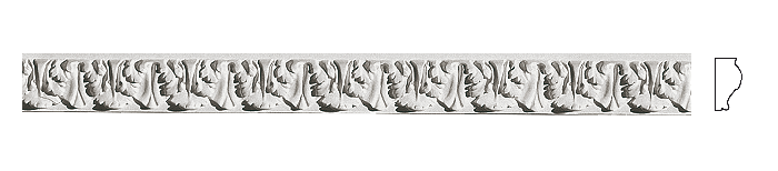 Гипсовый карниз с выразительным растительным орнаментом, создающим эффект естественного роста. Узор образован ритмичным переплетением стилизованных листьев, где каждый элемент обладает сложной объемной текстурой с прожилками и изгибами. Глубокий рельеф достигается за счет многоуровневой моделировки, создающей живую игру света — от мягких бликов на выпуклых частях до насыщенных теней в углублениях.