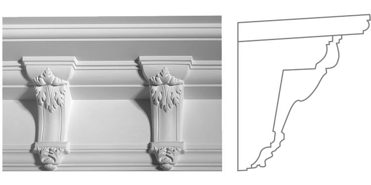 Этот карниз сочетает строгую горизонтальную линию и выразительные вертикальные акценты. Верхняя полоса задает четкий архитектурный ритм, а две консоли, напоминающие стилизованные пилястры, украшены сложным растительным орнаментом. Каждый элемент орнамента тщательно проработан: изгибы листьев и лепестков создают динамичный рельеф, который оживает при освещении, образуя глубокие тени и мягкие переходы.