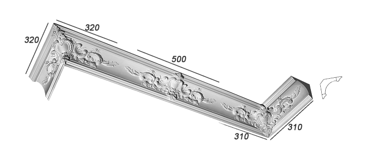 Гипсовый карниз с орнаментом в виде листьев аканта. Центральный мотив дополнен симметричными завитками. Ритмичный рисунок повторяется по всей длине изделия.