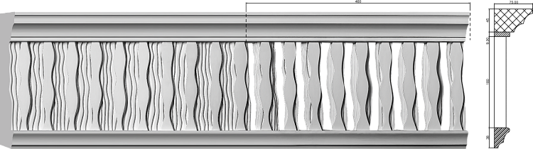 Карниз из трёх горизонтальных полос, где центральный рельеф становится выразительным акцентом. Верхняя и нижняя полосы выполнены гладкими и ровными, создавая строгое обрамление и подчёркивая чистоту линий. Средняя полоса представляет собой сложную рельефную структуру, составленную из вертикальных волнообразных элементов.
