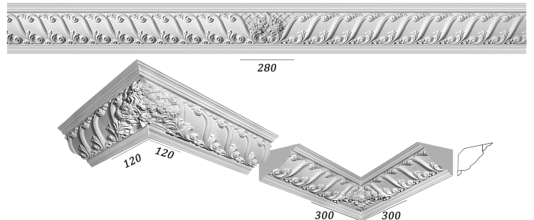 Прямоугольная горизонтальная форма и чёткие грани подчёркивают архитектурную строгость карниза, а игра света и тени раскрывает богатство текстуры и рельефа. Профиль изделия обеспечивает простой монтаж и безупречное прилегание к поверхности. Карниз станет изысканным решением для интерьеров в стиле барокко, рококо или неоренессанса, наполняя пространство повествовательной красотой, рукотворной элегантностью и классическим шиком.