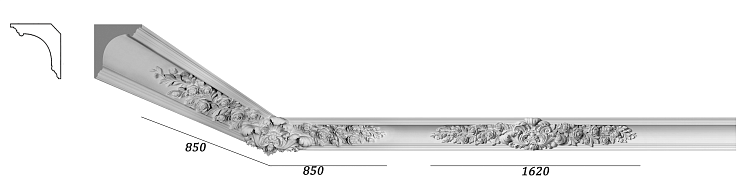 Глубокий рельеф и филигранная детализация усиливают восприятие трёхмерности, превращая карниз в настоящее произведение искусства. Профиль изделия адаптирован для простого монтажа и безупречного прилегания к поверхности. Карниз станет изысканным решением для интерьеров в стиле барокко, рококо или неоренессанса, наполняя пространство природной элегантностью, роскошью и повествовательной красотой.