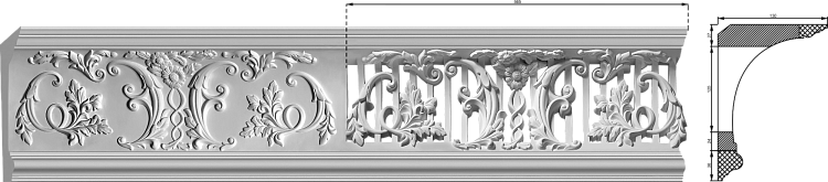 Карниз с рельефным орнаментом, выполненный в классическом архитектурном стиле. Основу композиции составляют вертикальные планки, объединённые изящными декоративными элементами в форме листьев и завитков. На верхней части фриза расположены небольшие цветочные мотивы, добавляющие узору тонкую детализацию и природную гармонию.